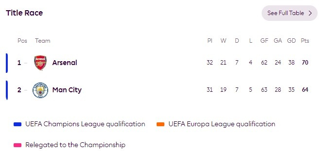If the two teams finish the season with the same number of points, the Premier League title will be decided by goal difference, a statistic where the two sides are also extremely close. Arsenal have scored 62 goals and conceded 24, giving them a goal difference of +38, while Manchester City's goal difference stands at +35.